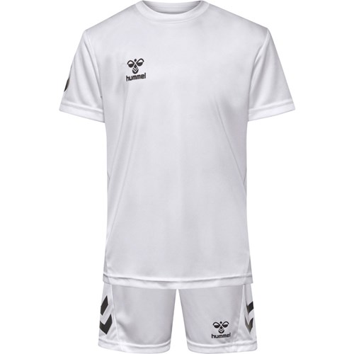 Hummel sæt består af et par shorts og en T-shirt. Polyestersættet har en normal pasform med en elastisk linning i shortsene for komfort og let at have på for aktive børn. Logoprintet og sidevinklerne tilføjer et sporty touch.