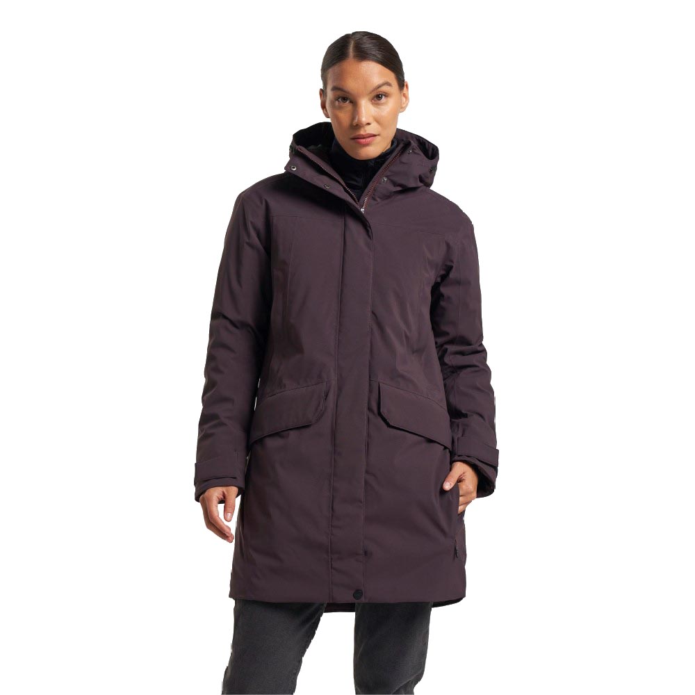 Tenson Eve jakke er en klassisk vandafvisende dameparka med fast hætte. Jakken har tapede sømme og Tensons proprietære MPC-teknologi (WP 5.000 mm / MP 5.000 g/m2/24h), som kombinerer meget effektiv vandtætning med enestående åndbarhed. På dage hvor det er lidt varmere, kan lynlåsen åbnes fra begge ender for ekstra ventilation. Den har to diskrete brystlommer med lynlås og to håndvarmerlommer, der kan åbnes foroven og fra siderne. Leveres med E-dye polyesterfor og en PFC-fri vandafvisende finish.