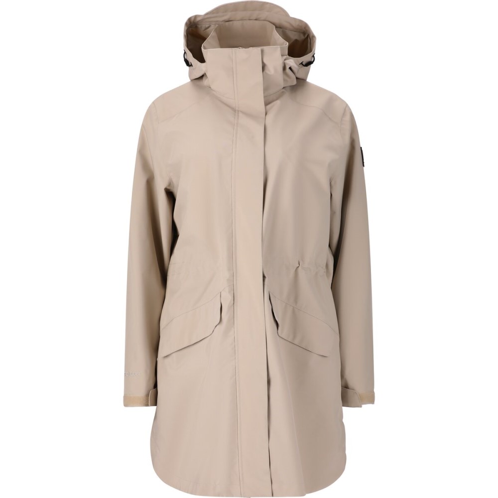 Whistler lang jakke med gennemgående lynlås. Jakken er vandtæt og åndbar. Jakken har stilkoller, aftagelige hætte og kan reguleres ved håndleddene med velcro. Jakken har et vandsøjletryk på 10.000 mm.